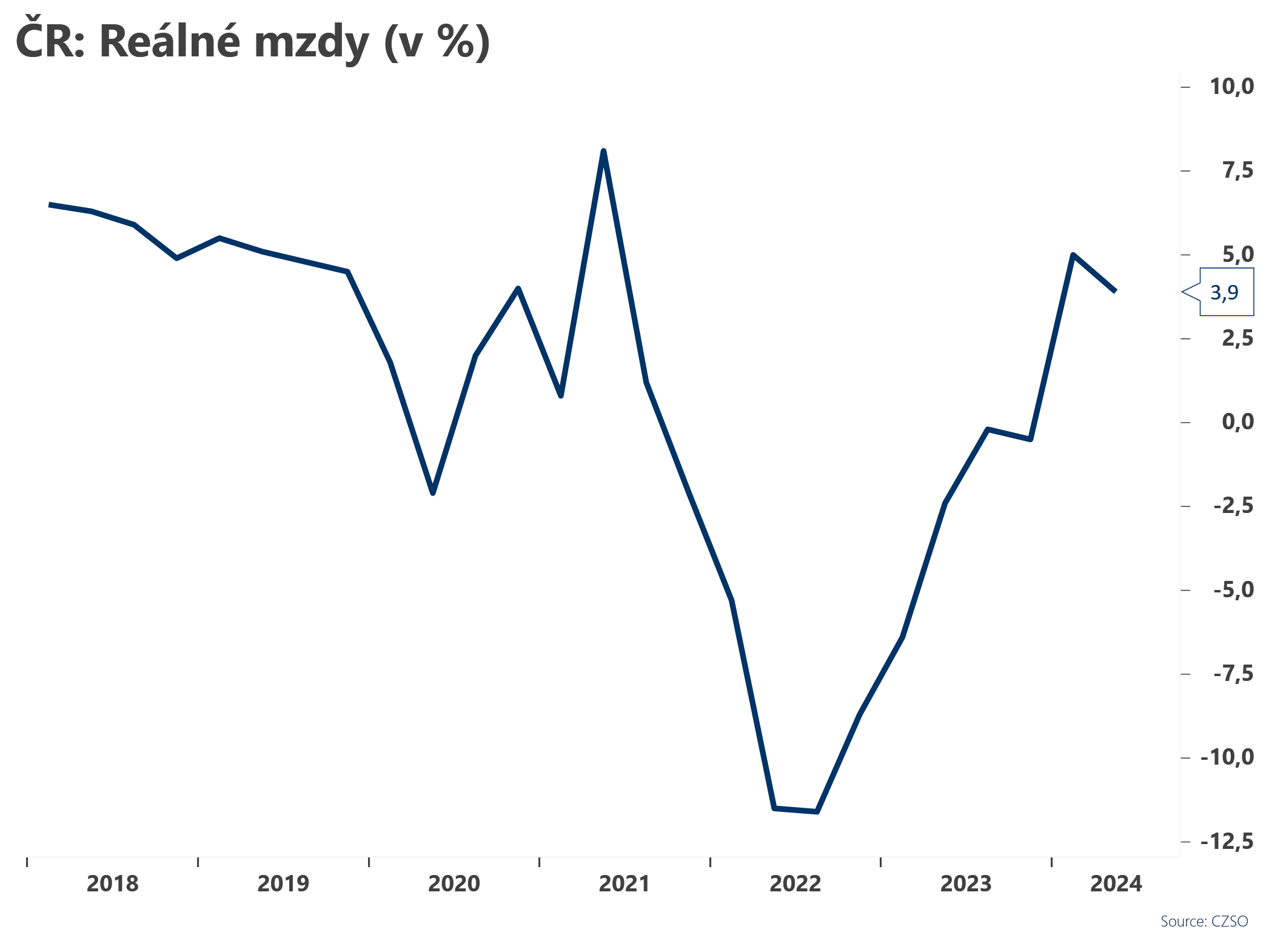 Reálné mzdy se ve 4. čtvrtletí loňského roku snížily na 4,2 % meziročně oproti revidovaným 4,7 % ve 3Q 2024. Trhy očekávaly snížení na 3,8 % meziročně. -