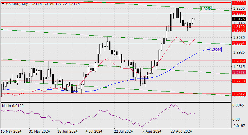 Pokud budou údaje tak dobré, jak se předpokládá, investoři výrazně zredukují pravděpodobnost dvojího snížení úrokových sazeb Fedu a libra bude moci prorazit pásmo supportu 1,3090–1,3120 a zamířit k úrovni 1,2994. To je náš hlavní scénář. Oscilátor Marlin, který se obrací dolů, tento scénář podporuje. Alternativa zahrnuje pokus překonat horní hranici cenového kanálu 1,3254 a další růst k ceně 1,3300.