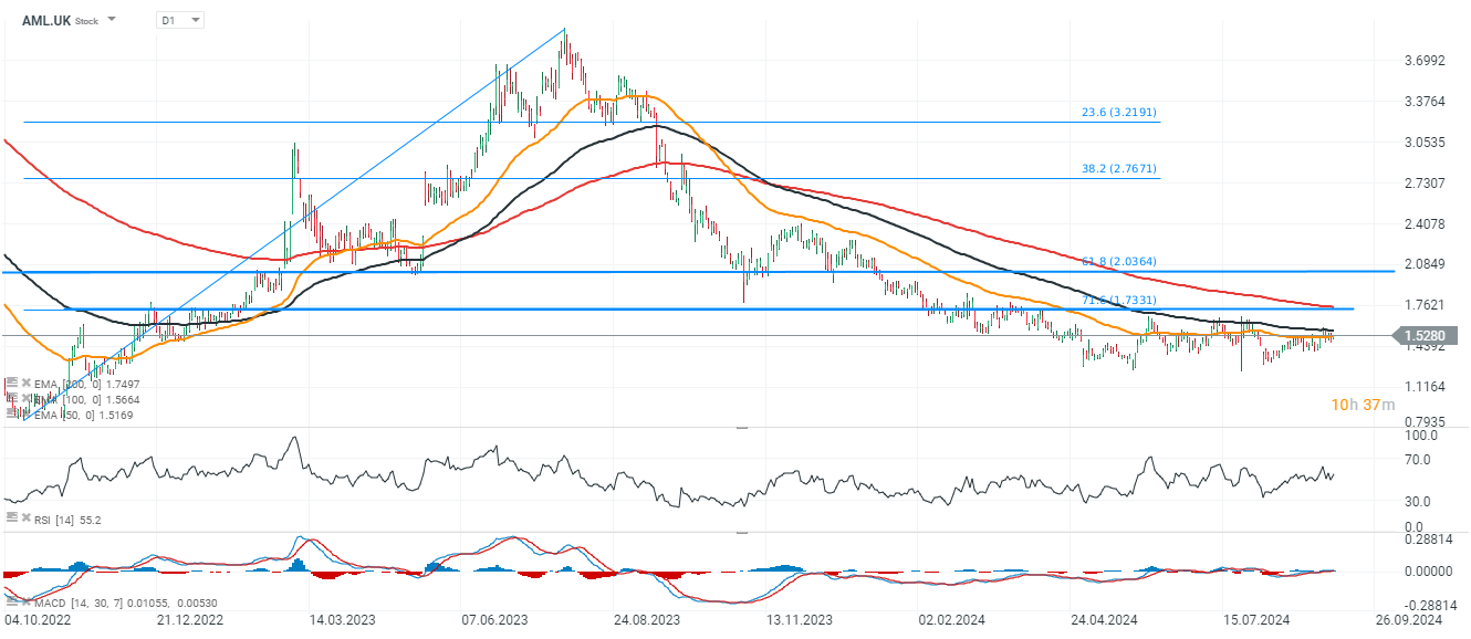 Akcie Aston Martin se obchodují poblíž červnových minim, ale prolomily se nad EMA50 (oranžová čára), hlavní úroveň odporu je aktuálně kolem 1,73 – 1,75 £ za akcii (23,6 Fibo, průměr EMA200).