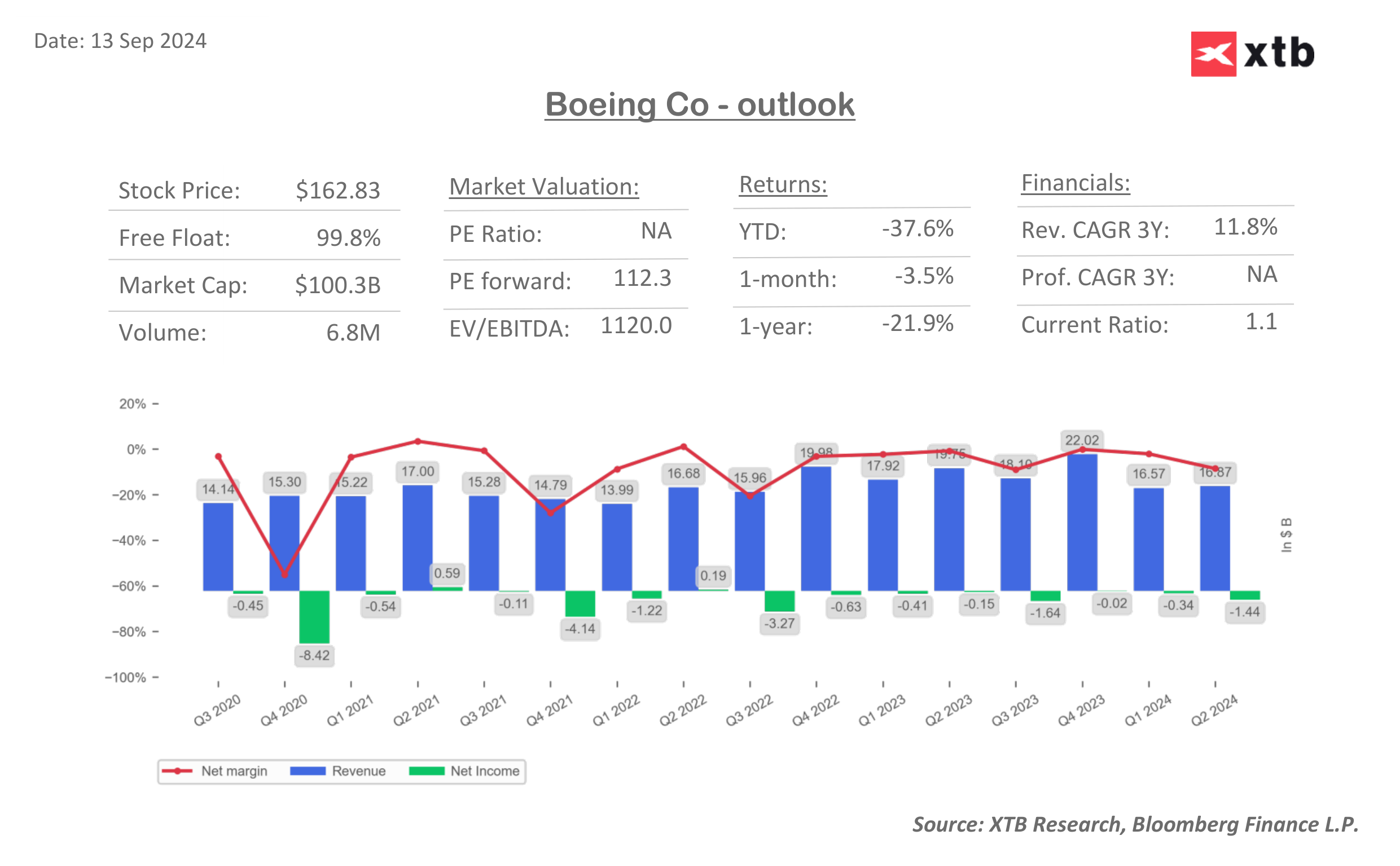 Akcie Boeingu klesly před otevřením obchodu o téměř 5 %, což znamená nejnižší hodnotu akcií od listopadu 2022. Zdroj: xStation