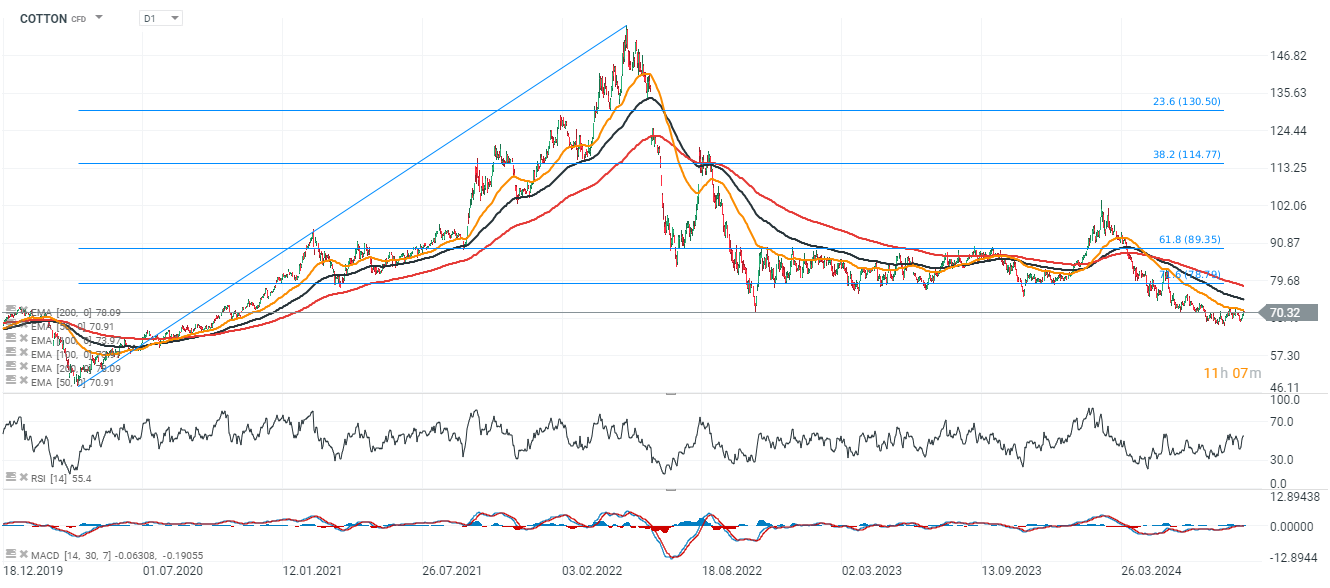 Bavlna se blíží exponenciálnímu klouzavému průměru 50 sezení v denním intervalu (EMA50, oranžová čára) na 71 USD.