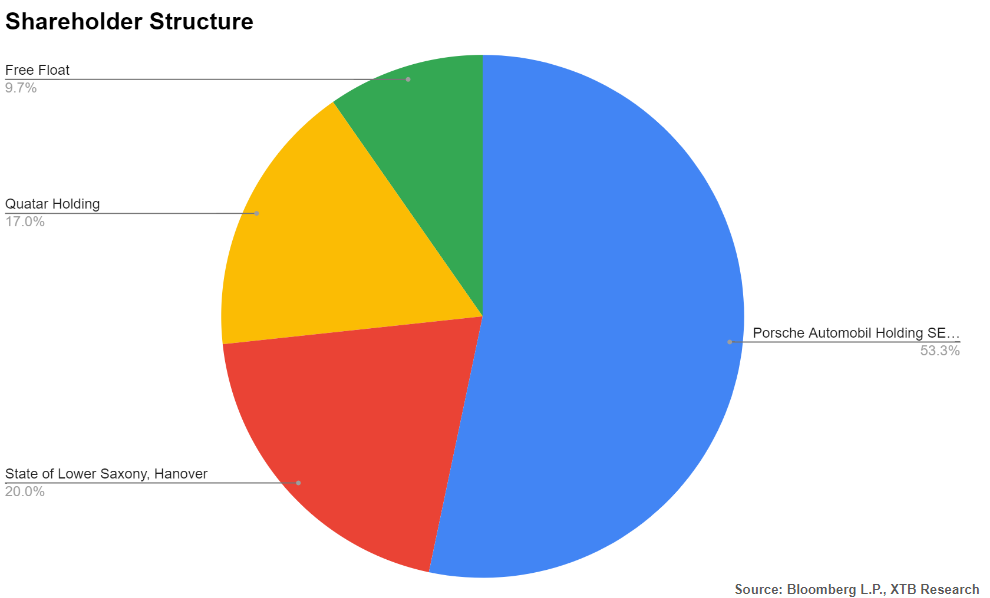 Největším akcionářem je společnost Porsche SE, ovládaná rodinami Porsche a Piëch, která vlastní 31,9 % akcií, což znamená, že kontroluje 53,3 % hlasovacích práv. Dolní Sasko vlastní 11,8 % akcií a 20 % hlasovacích práv a Qatar Investment Authority 10,5 % akcií a 17 % hlasovacích práv. Tato koncentrace vlastnictví a hlasovacích práv v rukou několika klíčových akcionářů má významný vliv na řízení společnosti a strategické rozhodování.