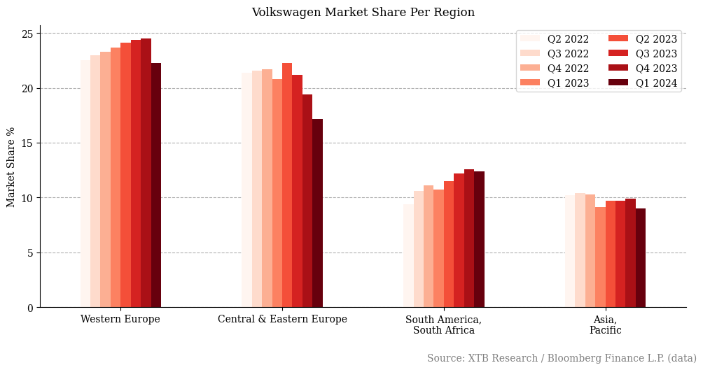 Čína, která je pro koncern Volkswagen největším samostatným trhem, představuje stále větší výzvu. Přestože společnost v roce 2023 dodala v Číně 3,2 milionu vozů (meziroční nárůst o 1,6 %), její tržní podíl klesl na 14,5 % z 15,1 % v předchozím roce. Tento trend je znepokojivý zejména v souvislosti s rostoucí konkurencí místních výrobců elektromobilů, kteří rychle získávají podíl na trhu.