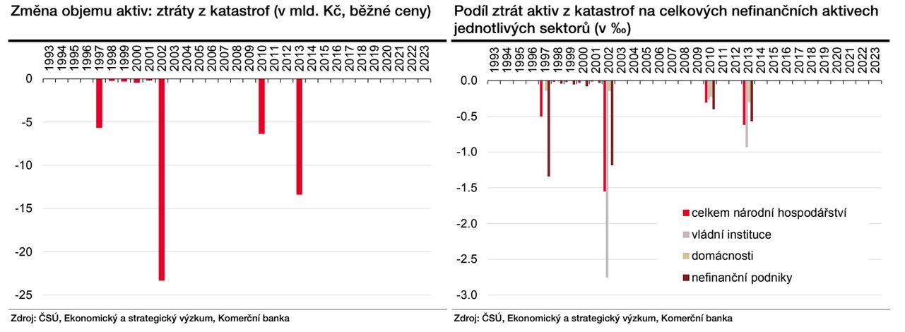 Pojďme se ale podívat na to, jak destruktivní byly povodně, které jsme již v minulosti zažili, jak ty se podepsaly na zničení majetku. Pohled do národního účetnictví odhalí, že ztráty z katastrof, kam u nás téměř výlučně patří povodně, byly výrazné v letech 1997, 2002, 2010 a 2013. Nejvýraznější snížení hodnoty aktiv bylo zaznamenané v roce 2002, kdy přesáhlo 23 mld. Kč v tehdejších cenách. Zničeno tak bylo 1,6 promile hodnoty veškerých nefinančních aktiv. V roce 1997 to pro srovnání bylo 0,5 promile, v roce 2013 pak 0,6 promile.