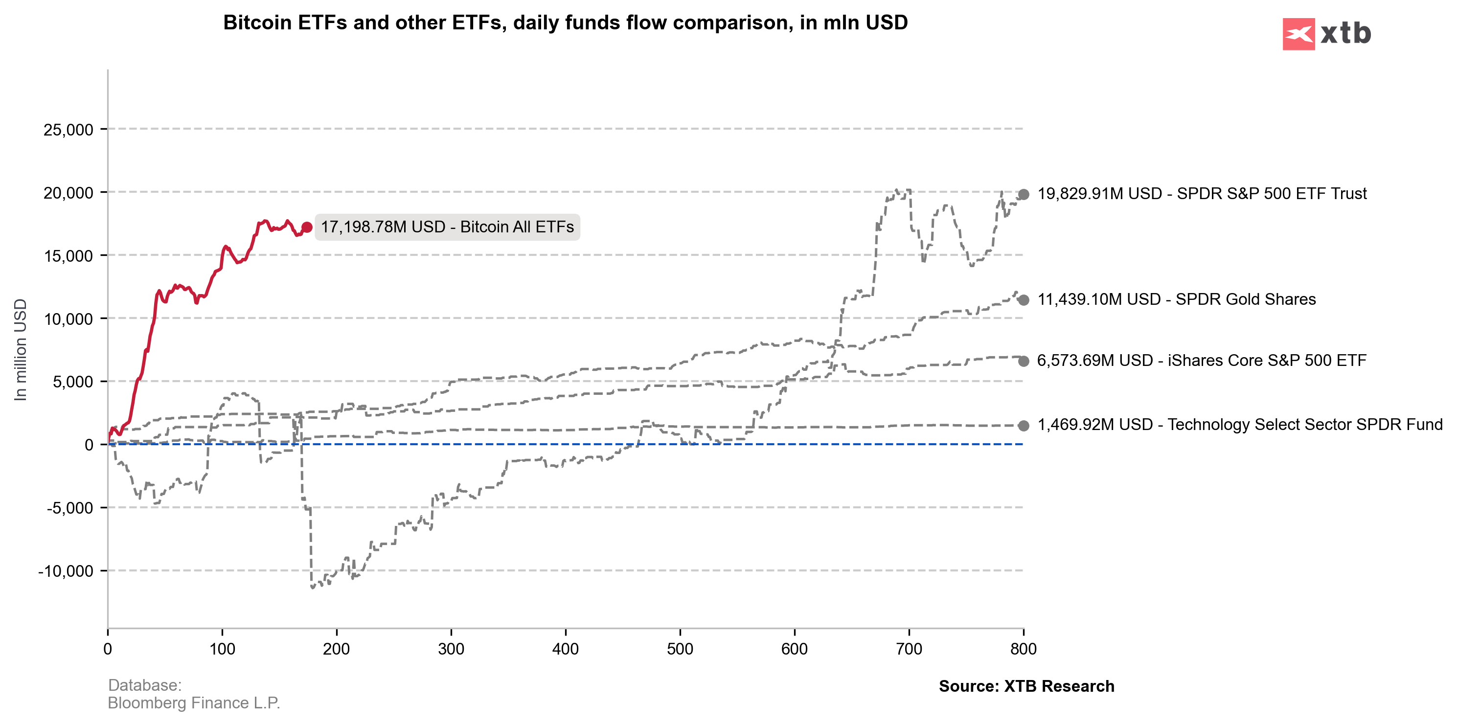 Čistý příliv do BTC ETF v letošním roce činí téměř 17,2 miliardy USD v porovnání s 20 miliardami USD u „vlajkové lodi“ S&P 500 ETF. To je stále skvělý výsledek