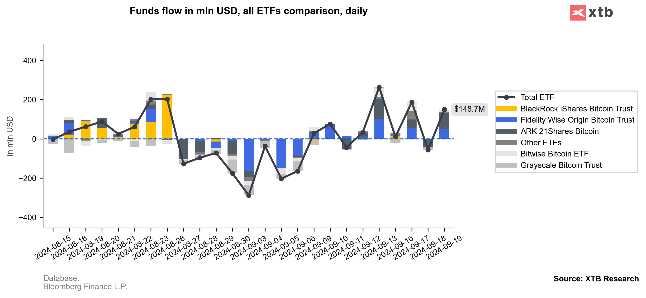 Nižší očekávané úrovně úrokových sazeb Fedu, téměř v souladu s očekáváním „holubičího“ trhu, síla Wall Street a slabý dolar, podpořily sentiment trhu s bitcoiny a kryptoměnami. Den po snížení sazeb Fedem činil čistý příliv do ETF téměř 150 milionů dolarů – ne tolik, když se podíváme na reakce trhů.