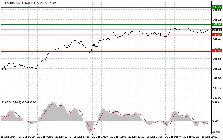 Scénář č. 2: Pár USD/JPY dnes plánuji prodávat i v případě dvou po sobě jdoucích testů ceny 145,04, když bude indikátor MACD v zóně překoupenosti. Toto omezí růstový potenciál páru a přinese obrat trhu směrem dolů. Můžete očekávat pokles k opačným úrovním 144,62 a 143,96.