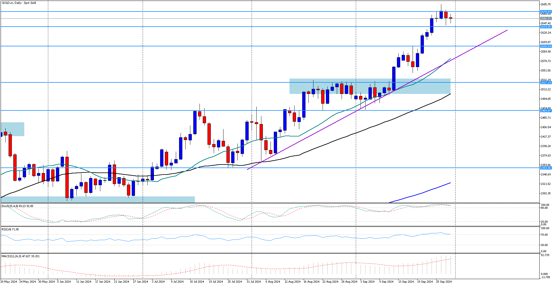 Zlato se obchoduje do strany, mírně pod svým nedávným historickým maximem 2685. Vzhledem k tomu, že dolar zůstává v pozadí, trh se připravuje na akční týden, jehož hlavním bodem v kalendáři údajů z USA bude páteční údaj o mzdách mimo zemědělství. Obchodníci se zlatem by si tak po dalším silném týdenním výkonu mohli oddechnout a jedním okem sledovat vývoj na Blízkém východě. Momentové ukazatele jsou mezitím o něco méně býčí. Index RSI zůstává nad svým středem, ale zřetelně se posouvá směrem dolů. Stejně tak index průměrného směrového pohybu (ADX) se pohybuje výrazně nad svým středem 25. Vykazuje však malou chuť k pohybu vzhůru, a proto ukazuje na mírně slabší býčí trend zlata. Důležitější je, že stochastický oscilátor dokončil 50 dní uvnitř svého překoupeného teritoria (OB), ale překročil svůj klouzavý průměr (MA). Pokud by tento pohyb směrem dolů pokračoval, mohlo by to být považováno za silný medvědí signál. Pokud si býci zachovají důvěru, mohli by se pokusit znovu získat otěže trhu a postupně překonat historické maximum na úrovni 2685. Pokud by se jim to podařilo, vstoupili by opět do neprobádaných vod, přičemž dalšími pravděpodobnými cíli by byly úrovně 2 700, respektive 2 750, které by mohly být snadno překonány, pokud budou tržní síly i nadále velmi silné. Na druhé straně medvědi touží po dlouho očekávané korekci. Ti by mohli zlato tlačit směrem k úrovni 2 601, ale jejich hlavním cílem je pravděpodobně obsazená oblast 2 521-2 532 bodů. Tu vyplňuje maximum z 20. srpna 2024 a 50denní jednoduchý klouzavý průměr (SMA). Ještě níže by pak medvědi mohli otestovat support stanovený maximem ze 17. července 2024 na úrovni 2484.