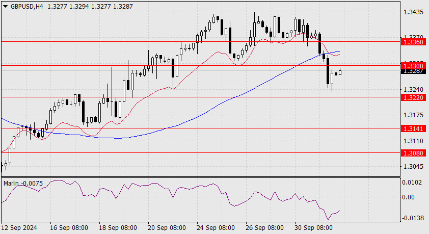 Včera britská libra synchronně s ostatními měnami vyskočila vzhůru a dosáhla technické úrovně - pro libru to byla úroveň rezistence 1,3300 (s nepatrnou odchylkou). Horní hranice cenového kanálu byla prolomena a kanál nabyl nového tvaru. Dnes ráno libra aktivně klesá, přičemž cílem je nejbližší zapuštěná linie cenového kanálu kolem úrovně supportu 1,2994 nebo o něco výše (1,3000) na minimu z března 2022. -