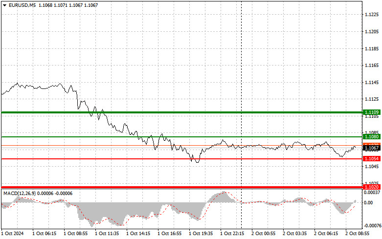 Úroveň 1,1075 byla otestována, když už indikátor MACD výrazně klesl pod úroveň nula, což omezilo potenciál páru klesat. Proto jsem euro neprodával. Krátce nato došlo k druhému testu, když už byl indikátor MACD v zóně přeprodanosti, což umožnilo realizovat scénář č. 2 pro nákupní obchod, ale výrazný růst nenásledoval. Slabé údaje o výrobním indexu PMI v eurozóně vedly v první polovině dne k poklesu eura. Výprodej pokračoval i během americké seance po eskalaci íránsko-izraelského konfliktu. Dnes se očekávají údaje o nezaměstnanosti v eurozóně, ale vzhledem k jejich výrazně opožděnému zveřejnění je nepravděpodobné, že by podpořily euro. Dnes také vystoupí viceprezident Evropské centrální banky Luis de Guindos a člen Výkonné rady ECB Philip Lane. Jejich výroky by v první polovině dne mohly vyvinout další tlak na euro. V rámci intradenní strategie se zaměřím spíš na realizaci scénářů č. 1 a 2.