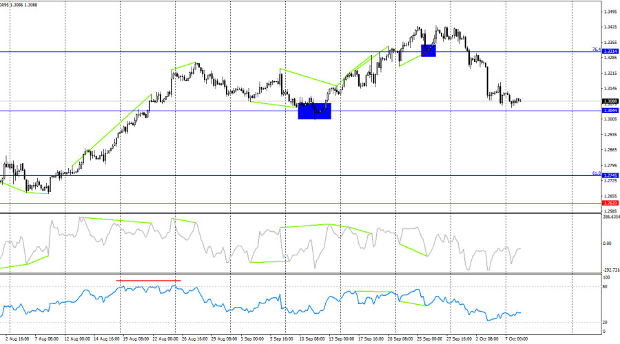 Vlnový pattern je jasný. Poslední dokončená vzestupná vlna (26. září) nepřekonala vrchol předchozí vlny a aktuálně se tvořící sestupná vlna snadno prorazila dno předchozí vlny 1,3311. Býčí trend je teď tedy považován za ukončený a začíná se formovat medvědí trend.