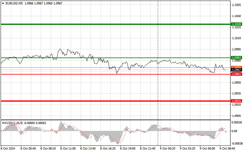Scénář č. 2: Dnes plánuji koupit euro také v případě, že dojde ke dvěma po sobě jdoucím testům ceny 1,0961, když se bude ukazatel MACD nacházet v oblasti přeprodanosti. To omezí potenciál páru směrem dolů a mohlo by to vést k obratu trhu směrem vzhůru. Můžeme očekávat růst k opačným úrovním 1,0983 a 1,1028.