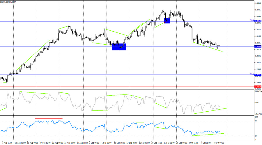 Pár GBP/USD ve čtvrtek v grafu 1H zůstával poblíž korekční úrovně 127,2 % (1,3054), a dokonce se pod ní konsolidoval. Dnes ale po zveřejnění ekonomických údajů ze Spojeného království začal oživovat. Včera byl naopak pod tlakem kvůli údajům o inflaci v USA. Britská libra by mohla brzy začít stoupat, i když dnes pravděpodobně ne. Cílem je úroveň 1,3151.