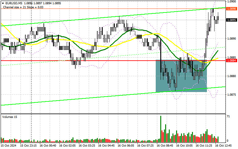 Ve své dopolední předpovědi jsem se zaměřil na úroveň 1,0884 a plánoval jsem se na jejím základě rozhodnout o vstupu do trhu. Podívejme se na 5minutový graf a analyzujme, co se stalo. Pokles a vytvoření falešného proražení kolem úrovně 1,0884 poskytly vynikající vstupní bod pro nákup eura. Výsledkem byl růst o více než 15 bodů, po kterém poptávka po euru opadla. Ve druhé polovině dne byl technický obrázek revidován.