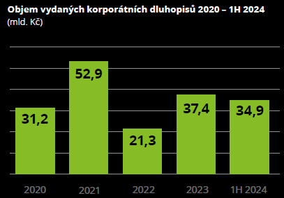 V první polovině roku 2024 byly vydány korunové korporátní dluhopisy v hodnotě 34,9 miliardy Kč. Tento objem byl téměř na úrovni celkového objemu emisí za celý rok 2023. Průměrná emise byla v hodnotě 317,7 milionu Kč.