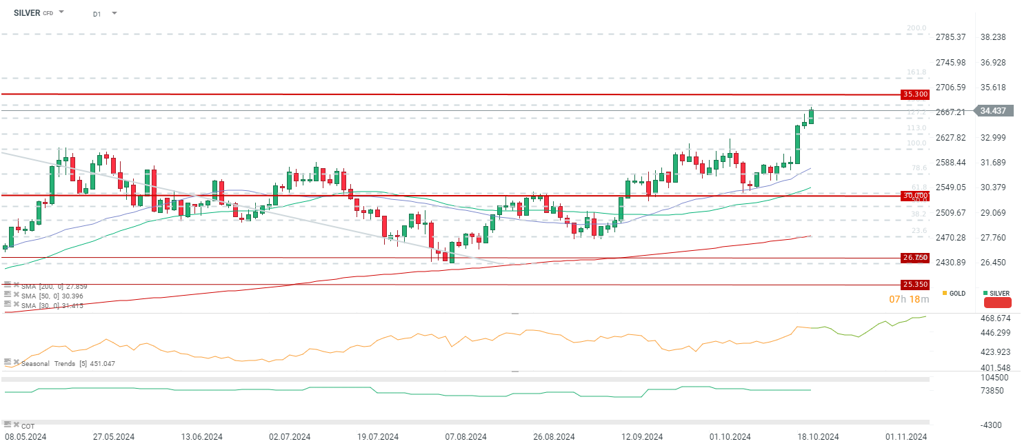 Stříbro, mnohem levnější alternativa ke zlatu, v posledních několika seancích výrazně vzrostlo. Minulý pátek stříbro narostlo o více než 6 % a tím prorazilo lokální vrcholy z počátku října. Nyní se blíží úrovni 35,3 USD za unci, což je nejvyšší úroveň za posledních 12 let (od října 2012). Pokud stříbro tuto úroveň překoná, dosáhne nejvyšší hodnoty od února 2012.