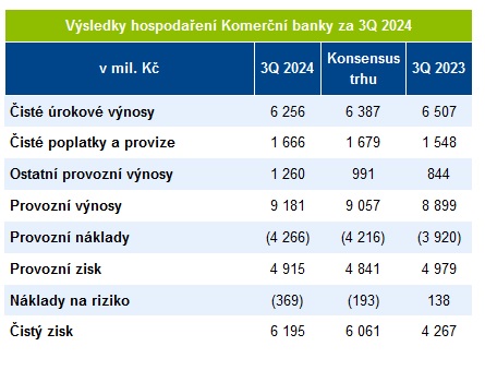 Komerční banka tak dosáhla celkových provozních výnosů ve výši 9 181 mil. Kč (meziročně + 3 %), při očekávání 9 057 mil. Kč.