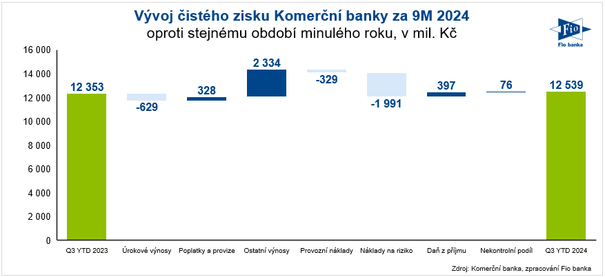Za 9 měsíců tohoto roku tak Komerční banka dosáhla zisku 12 539 mil. Kč, meziroční nárůst o 2 %.