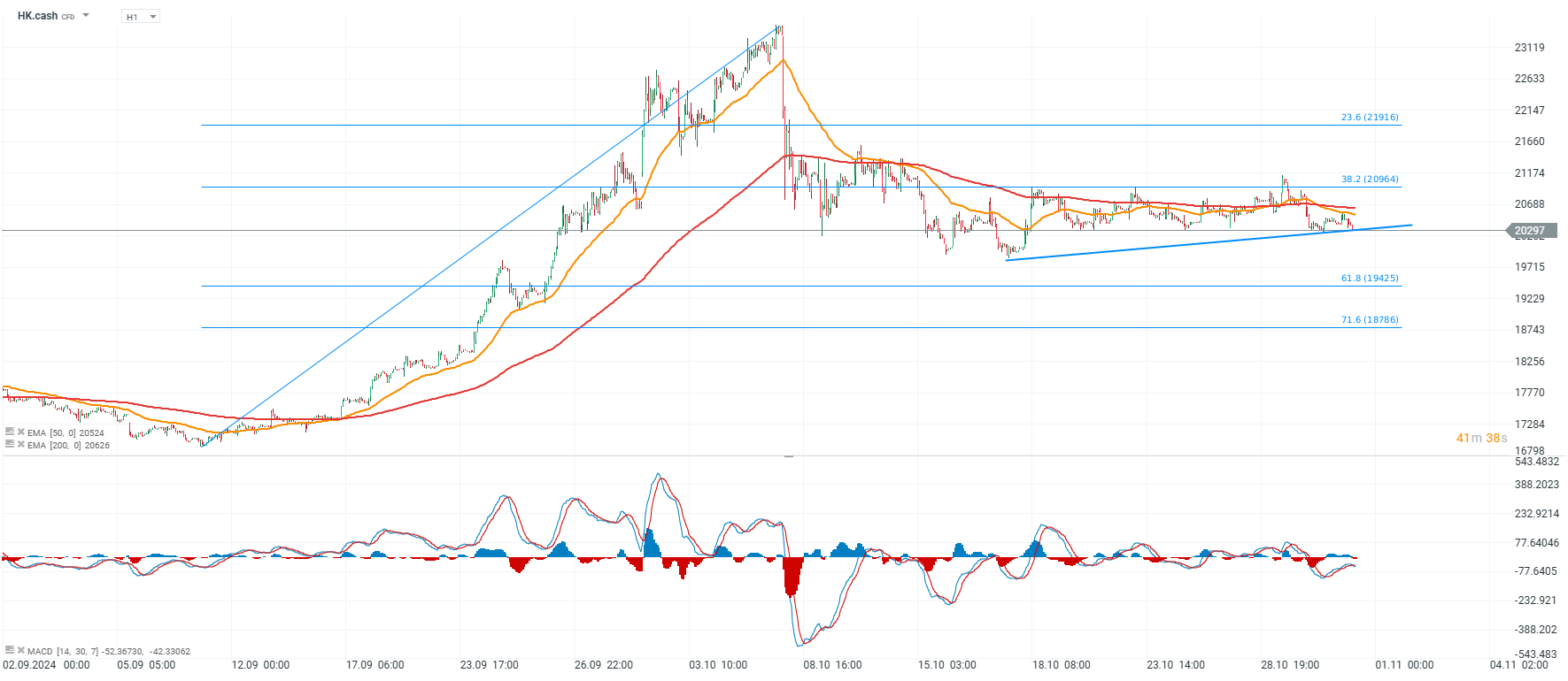 Výdaje na soukromou spotřebu se meziročně snížily o 1,4 % a mezičtvrtletně o 1,6 %. Dovoz se za prvních 9 měsíců roku 2024 snížil o 7,1 %, zatímco vývoz meziročně vzrostl o 10,7 %. Hongkong v prvních devíti měsících roku 2024 navštívilo 32 milionů návštěvníků (meziročně o téměř 40 % více), ale Čína odhaduje, že letos jich přijede 46 milionů, takže zatím není jasné, zda konečný údaj bude odpovídat těmto očekáváním. HK.cash dnes ztrácí téměř 0,5 %.