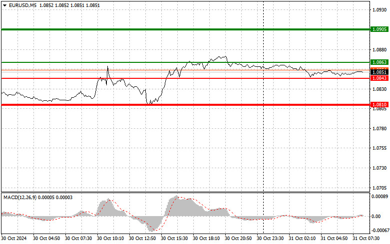 K otestování ceny 1,0844 došlo ve chvíli, když se ukazatel MACD už výrazně posunul směrem dolů od nuly, což omezilo potenciál páru směrem dolů – zejména v podmínkách nízké volatility, které se během dne očekávaly. Z toho důvodu jsem euro neprodával a pohyb páru směrem dolů jsem přehlédl. K poklesu došlo po vyjádřeních představitelů Federálního rezervního systému, kteří po zářijovém snížení sazeb o půl procentního bodu naznačili, že preferují pomalejší tempo snižování sazeb, než se původně očekávalo. Vzhledem k tomu, že v první polovině dnešního dne nebyly k dispozici žádná významná data, euro by se mohlo mírně zotavit. Významnou překážkou by však mohla být prohlášení člena bankovní rady Evropské centrální banky Joachima Nagela a prezidentky ECB Christine Lagarde, neboť evropští politici se v poslední době stále více vyslovují pro agresivnější snižování sazeb v eurozóně. V rámci své intradenní strategie se zaměřím spíše na realizaci scénářů č. 1 a 2. -