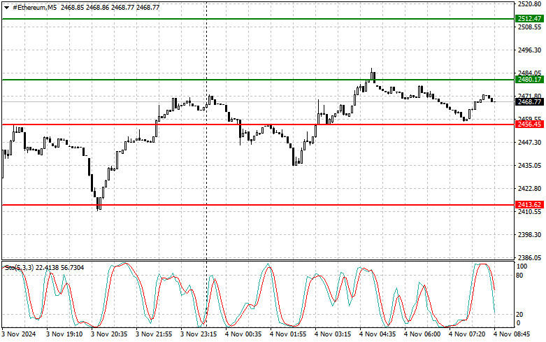 Scénář pro nákup: Ethereum dnes nakoupím na vstupním bodě kolem 2 480 USD s cílem růstu na 2 512 USD. Tam nákup ukončím a při odrazu okamžitě prodám. Před nákupem při průrazu se ujistěte, že Stochastic je u spodní hranice, tedy u hladiny 20.