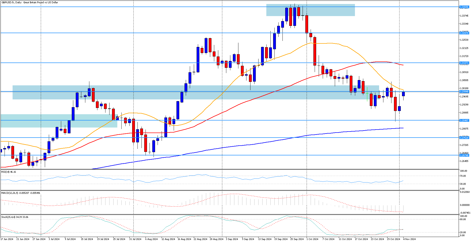 Vzhledem k Trumpově politice mohou investoři očekávat agresivnější reakci Fedu na řízení potenciální inflace. Tento výsledek by mohl docela dobře vést k ještě většímu růstu dolaru vzhledem k tomu, že se ukazuje, že jde o poměrně těsný souboj. Nejistý výsledek vede investory k opatrnému postoji a mnozí vyčkávají, jak výsledky voleb mohou ovlivnit budoucí politická rozhodnutí Fedu a celkový sentiment na trhu. To se projevilo tím, že akcie se minulý týden příliš nepohnuly, VIX vzrostl a zlato dosáhlo nových rekordních hodnot. GBP/USD zůstane medvědí přinejmenším do amerických voleb bez ohledu na to, co se mezitím stane. Již dvakrát se měnový pár GBP/USD odrazil přesně tam, kde potřeboval: těsně nad úroveň 1,2900, kde se do hry dostává dlouhodobá býčí trendová linie sahající až do září 2022. Nadále naráží na rezistenci kolem oblasti 1,2980-1,3000, kterou je třeba dobýt zpět, aby se zvýšila atraktivita pro býky. Pokud by se cena odrazila zpět, mohli bychom se zpočátku dočkat vytlačení ceny výše ke kurzu 1,3050 a poté potenciálně vystoupat k další oblasti rezistence kolem 1,3150. Pokud se zde však rezistence udrží, medvědi budou mít pravděpodobně koncem tohoto týdne další šanci na prolomení býčí trendové linie. Zdá se, že na obzoru je průraz. Potenciální supporty pod trendovou linií se objeví kolem 1,2870, následované oblastí 1,2800, kde se sbíhá 200denní MA.