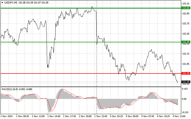 Scénář č. 1: Dnes plánuji koupit měnový pár USD/JPY na úrovni kolem 152,01 (zelená čára v grafu) s cílem růstu na 152,66 (tlustá zelená čára v grafu). Na úrovni 152,66 nákupy ukončím a otevřu prodeje v opačném směru (očekávám pohyb o 30–35 bodů v opačném směru od této úrovně). Dnes můžeme očekávat růst páru pouze po zveřejnění silných statistik z USA. Důležité! Před nákupem se ujistěte, že se ukazatel MACD nachází nad nulou a právě od ní začíná růst.