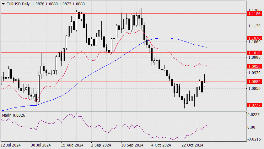Pokud se tento scénář potvrdí, euro by mohlo vystoupat k cílové úrovni 1,0950, nebo dokonce ještě výš, až k úrovni 1,1010, s cílem vytlačit kupce dolaru, kteří sázeli na Trumpovo vítězství. Dolar by pak mohl obnovit síly, ne kvůli vítězství Harrisové, ale kvůli strategii USA zaměřené na posilování své měny. Oscilátor Marlin přešel do pozitivního teritoria, což naznačuje pravděpodobnost pohybu spíše k nejbližší rezistenci 1,0950 než k nejbližšímu supportu 1,0777.