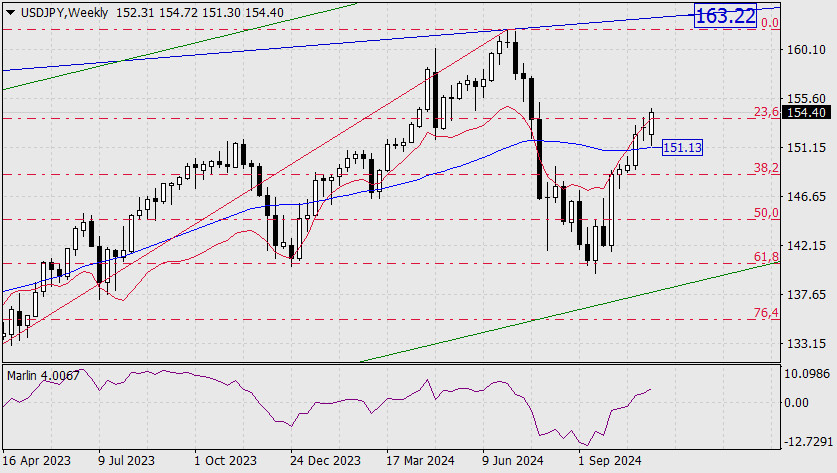 Měnový pár USD/JPY reagoval na prezidentské volby v USA velmi technicky. Ve středu se cena dostala z pásma 150,83–153,60 a oscilátor Marlin se od své neutrální linie nuly obrátil směrem vzhůru. Cíl na úrovni 156,39 je nyní otevřený, a pokud bude překonán, je možný další růst směrem ke 157,72.