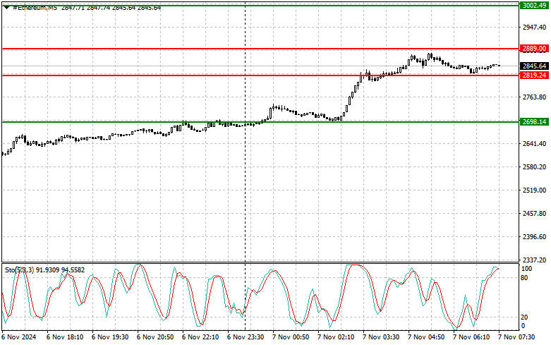 Ethereum dnes plánuji prodat na vstupním bodě 2 819 USD s cílem poklesu na 2 689 USD. Tam ukončím short pozice a otevřu long pozice; očekávám pullback. Důležité: Před prodejem se ujistěte, že indikátor Stochastic je u horní hranice (u hladiny 80).