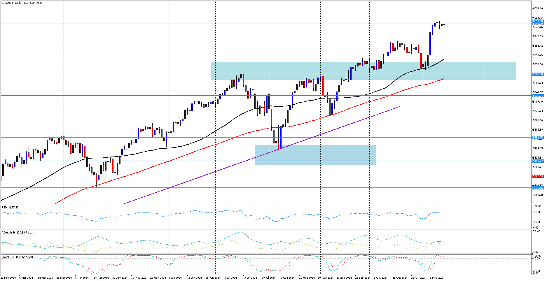 Americký akciový index SP 500 se již druhý den po sobě držel v blízkosti svého historického maxima 6 027 bodů poté, co celkové údaje o inflaci v USA odpovídaly očekávání a vykázaly mírný meziroční nárůst o 2,6 %. Z technického hlediska se nejnovější rally zastavila poblíž vzestupné linie, která spojuje maxima z července 2023 a července 2024. Oscilátor RSI i stochastický oscilátor blikají signály překoupenosti, což naznačuje, že vzestupná fáze je přetížená. Pokud se znovu objeví tlaky směrem dolů, mohlo by jako podpora působit předchozí maximum na úrovni 5870 bodů spolu s 20denním jednoduchým klouzavým průměrem (SMA). Pomocnou ruku o něco níže by mohly poskytnout 50denní SMA a rostoucí trendová linie ze srpna na úrovni 5760, zatímco oblast 5670 by mohla působit jako poslední obranná linie před případným negativním obratem trendu. Na druhé straně, pokud index dokáže rozhodně prorazit nad hranici 6 000 bodů, mohl by si tak otevřít cestu k úrovni 6 100 bodů a následně k úrovni 6 200 bodů. Prolomení hranice 6 000 bodů by mohlo znamenat pokračování vzestupného trendu, ale prozatím je na místě opatrnost, neboť trh stojí před klíčovou překážkou.