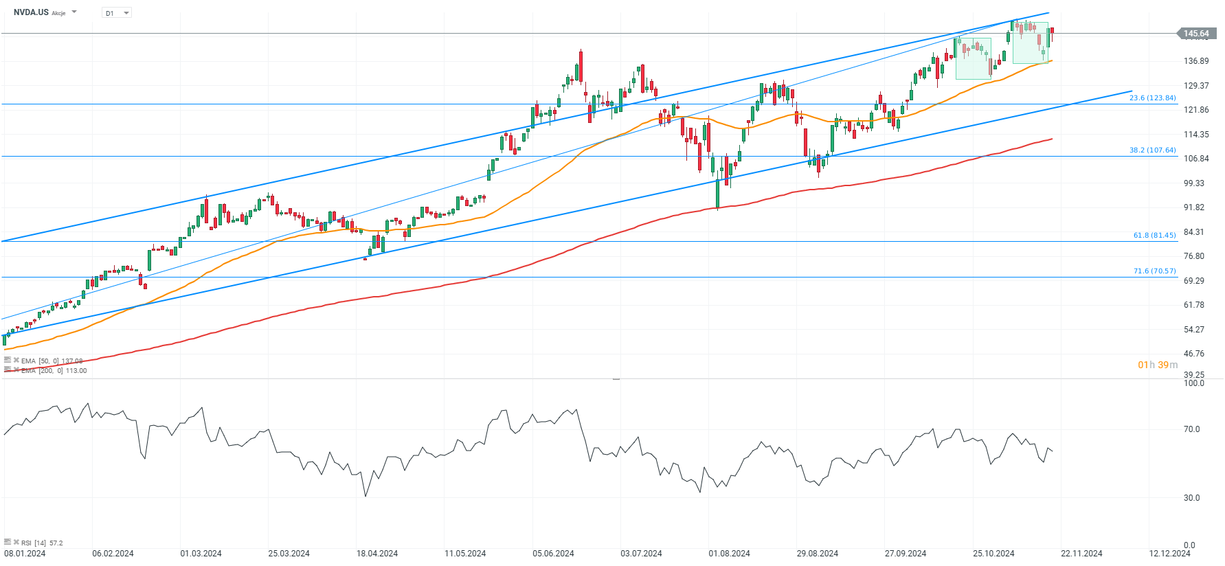- Zpráva o výsledcích je velmi silná a signalizuje, že boom umělé inteligence pravděpodobně ještě zdaleka neskončil, a to i přes vysoké ocenění technologických společností. Společnost Nvidia uklidnila trh ohledně prvních dodávek čipů Blackwell, i když naznačila, že při jejich výrobě skutečně existují určitá omezení. Reakce trhu nicméně naznačuje tlak na vybírání zisků z akcií společnosti Nvidia.