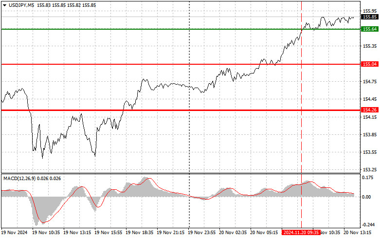 K otestování ceny na úrovni 155,64 v první polovině dne došlo v okamžiku, když ukazatel MACD výrazně vystoupal nad linii nuly, což omezilo potenciál páru směrem vzhůru. Z toho důvodu jsem dolar nenakupoval. S tím, jak se Fed posouvá směrem k více jestřábímu postoji, dolar vůči japonskému jenu nadále roste. Tento růst je způsoben několika faktory, včetně změn v měnové politice, silných ekonomických ukazatelů v USA a trvalé poptávce po americkém dolaru. Japonská ekonomika mezitím čelí problémům, jako je nízká inflace a zpomalující se růst. Tyto faktory nutí Bank of Japan zachovávat současnou politiku a naznačují pouze vzdálené zvyšování sazeb, což dále vyvíjí na kurz jenu tlak. Pouze nová prohlášení japonských politiků by mohla přerušit býčí trend na páru USD/JPY. Pokud jde o dnešní intradenní strategii, budu realizovat scénáře č. 1 a č. 2.