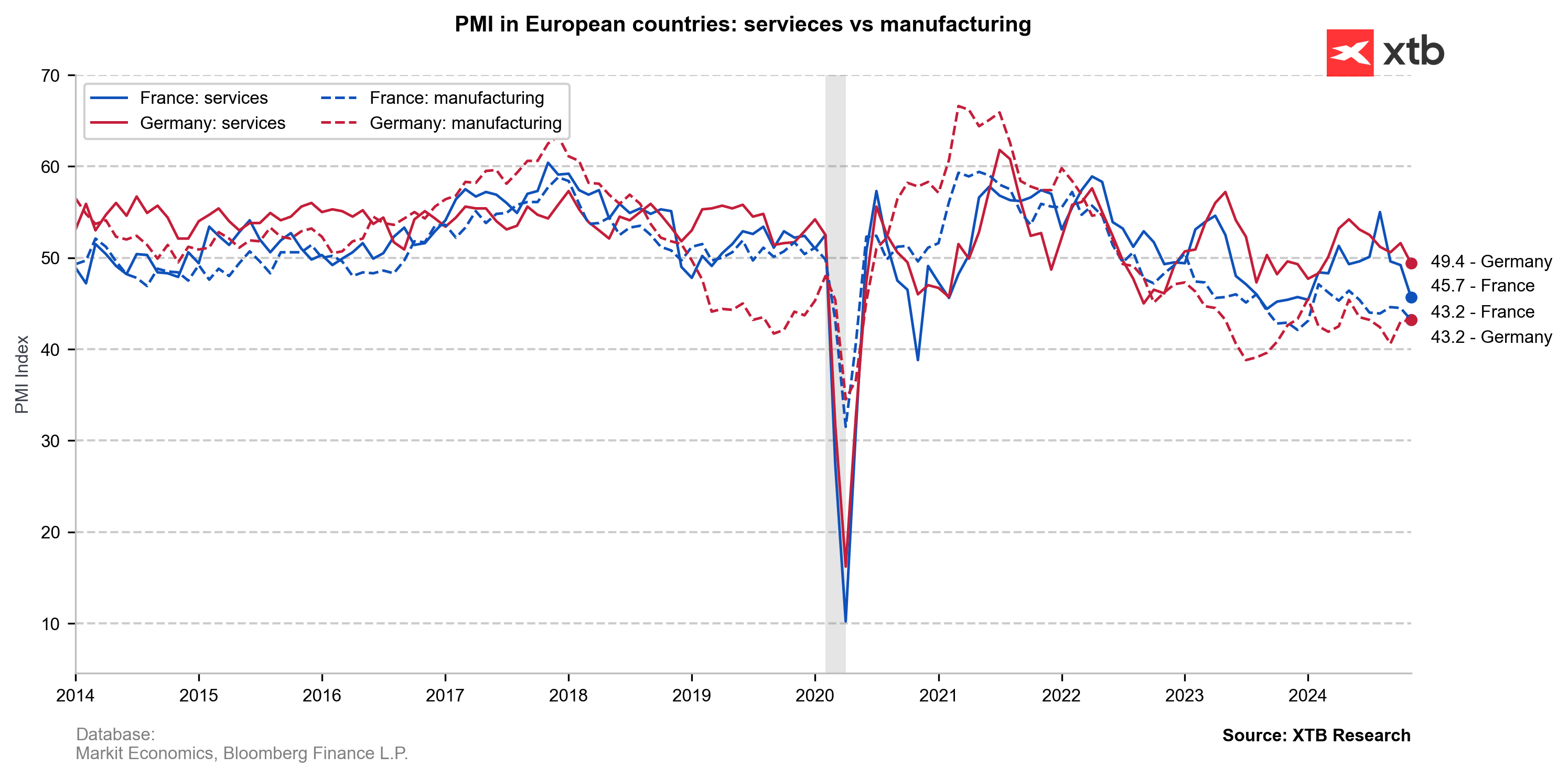 Údaje o PMI ve Francii a Německu byly nižší, než se očekávalo, a nižší než 50, což signalizuje pokles ekonomiky v klíčových odvětvích. Indexy PMI ve zpracovatelském průmyslu obou zemí byly nejslabší ze všech oznámených údajů, což podtrhuje pokračující potíže v průmyslové výrobě.