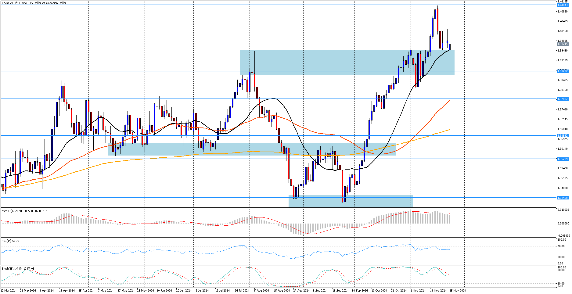 USD/CAD dnes stoupá a obchoduje se mírně nad maximem z 13. října 2022 na úrovni 1,3977. Poslední pokus býků CAD zatlačit USD/CAD pod vzestupnou trendovou linii z 25. září 2024 selhal a pár rychle stoupá vzhůru. Americkému dolaru také dodaly sílu čtvrteční silnější tisky amerických dat, geopolitika a jestřábí rétorika členů Fedu. Aby se současný býčí trend udržel, je pravděpodobně zapotřebí nový vrchol nad čtyřletým maximem 1,4104. Momentové ukazatele se mezitím postupně mění na medvědí. Konkrétně index průměrného směrového pohybu (ADX) se posouvá níže ke svému středu, a ukazuje tak na slabší býčí trend USD/CAD. Stochastický oscilátor navíc prorazil pod svou přeprodanou oblast (OS) a míří agresivně dolů. Pokud by tento pohyb pokračoval, bylo by to považováno za silný medvědí signál. Zajímavé je, že ukazatel RSI zůstává nad svým středem, ale nevykazuje velkou chuť k výraznějšímu pohybu vzhůru. Kdyby si medvědi zachovali sebedůvěru, mohli by se pokusit USD/CAD konečně stlačit pod maximum z 13. října 2022 na úrovni 1,3977 i pod trendovou linii z 25. září 2024. Poté by mohli otestovat support stanovený maximem z 1. listopadu 2024 na úrovni 1,3898. Ještě níže by se obsazená oblast 1,3807-1,3854 mohla ukázat jako obtížněji překonatelná, než si v současnosti představujeme. Na druhou stranu se býci pokusí USD/CAD vyhnat nad hladinu 1,3977 a poté jej postupně vytlačit výše směrem k maximu z 15. listopadu na úrovni 1,4104. Pokud se jim podaří tuto úroveň překonat, mohli by mít šanci zaznamenat nové maximum cyklu.