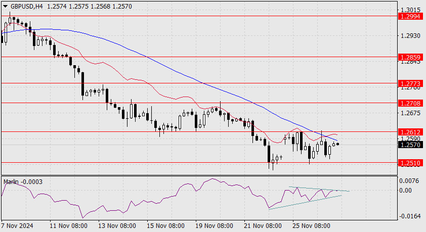 Přestože údaje z USA vykázaly růst o 2,4 % oproti očekávaným 2,3 %, index amerického dolaru klesl o 0,28 %. Libra vzrostla o 78 pipsů a téměř dosáhla cílové úrovně 1,3001. Oscilátor Marlin v denním časovém rámci se vrátil do kladných hodnot, což možná naznačuje, že jeho předchozí středeční pokles do medvědího teritoria byl falešným signálem. Nyní je zřejmé, že cena nabírá na síle, aby prorazila úroveň 1,3001 a pokračovala v růstu k další rezistenci na úrovni 1,3101, což je maximum z 15. října 2024. -