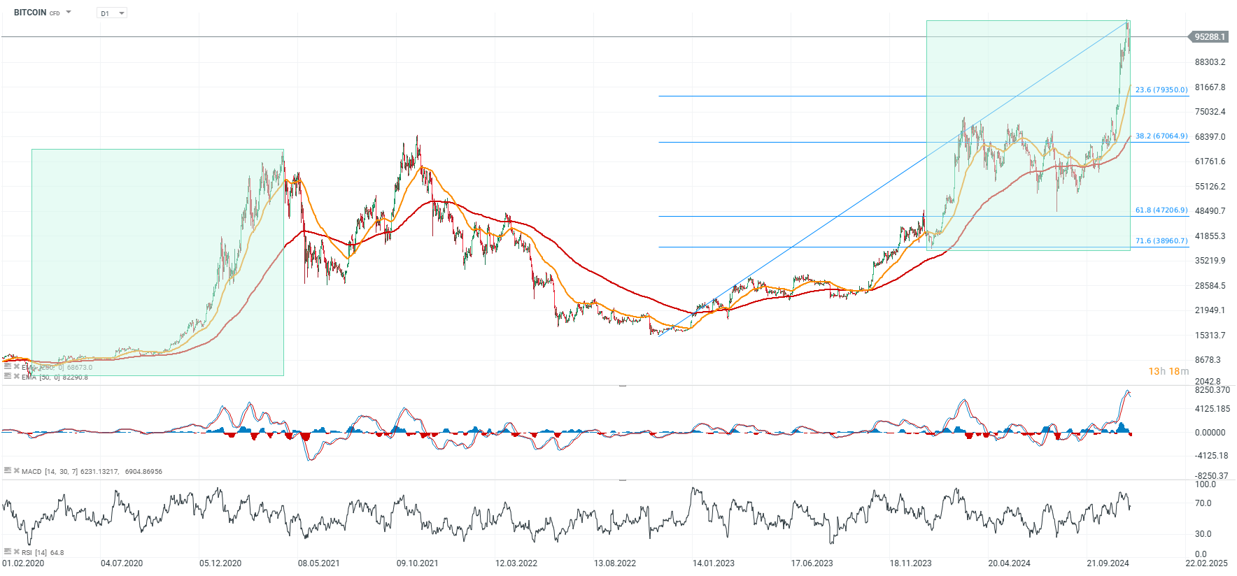 Při pohledu na graf kryptoměny v denním i hodinovém intervalu vidíme, že by se úroveň 80 000 USD mohla ukázat jako klíčová, a to při pohledu na 23,6 Fibo retracement celé vzestupné vlny z roku 2022 a 61,8 Fibo retracement nárůstu po Trumpově vítězství. Stažení z 99,5 tis. dolarů na 80 tis. dolarů by také odpovídalo podobným korekcím v předchozích cyklech bitcoinu.