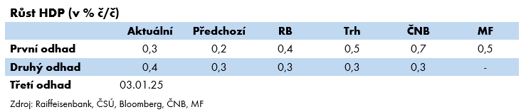 Nepřekvapivě hlavním tahounem české ekonomiky je domácí poptávka. Výdaje na konečnou spotřebu stouply mezičtvrtletně o 0,5 % a meziročně o 2,5 %, přičemž útraty domácností byly mezičtvrtletně vyšší o 0,7 % a meziročně o 2,2 %. Právě nízká spotřeba domácností stahovala českou ekonomiku do hlubin v minulých letech, nyní je tomu sice naopak, ale při porovnání s posledním předpandemickým kvartálem je stále nižší o 4,7 %. V případě výdajů vládních institucí došlo k mezičtvrtletnímu poklesu o 0,1 %, ale k meziročnímu navýšení o rovná 3 %. Z toho lze usuzovat, že se příspěvek fiskální politiky na růst HDP snižuje, ale v žádném případě nemá výraznější negativní důsledky. Hlavní negativum struktury růstu české ekonomiky je záporný příspěvek tvorby hrubého fixního kapitálu. Ta mezičtvrtletně poklesla o 1,2 % a meziročně o 0,8 %, když klesly zejména investice do obydlí, do ICT a ostatních strojů a zařízení. Naopak vzrostly investice do budov a staveb a dopravních prostředků. Takto směřované investice ovšem české ekonomice nepřinesou prosperitu v dalších letech. Pokud nebudou mít lidé kde bydlet, budeme přicházet o kvalifikovanou pracovní sílu, bez které se neobjede žádná ekonomicky silná země. Dalším důležitým segmentem jsou investice do technologií, protože pokud chceme transformovat tuzemskou ekonomiku z „montovny“ na moderní ekonomiku, není jiná možnost než podporovat v co nejvyšším měřítku výzkum, vědu a nejnovější technologie. K tomu ovšem aktuálně nepřispívá měnová politika ČNB, která drží sazby stále na velmi restriktivní úrovni a podle naší prognózy nečekáme v tomto ohledu výraznější změnu kurzu. Zahraniční poptávka zaostává, když se oživení u našich hlavních obchodních partnerů, zejména Německa, neustále posouvá v čase. Vývoz mezičtvrtletně sice stoupl o 1,9 %, ale růst dovozu byl ještě rychlejší (+3,2 %). V meziročním srovnání export vzrostl o 4 % především díky vývozu motorových vozidel, ale příspěvek automobilového průmyslu nemusí být v dalších měsících tak silný. Kromě velmi pomalého oživení ekonomik Německa i celé eurozóny je hlavním rizikem pro příští rok nástup Donalda Trumpa do úřadu prezidenta USA, který jasně deklaruje, že zavede cla na dovoz z Číny, Kanady, Mexika, ale také z EU. To může mít zcela zásadní dopad na malou otevřenou ekonomiku, jakou je ta naše, ať už přímo či nepřímo (především prostřednictvím Německa). Negativní vliv i nadále měla změna stavu zásob, ale její záporný příspěvek v meziročním srovnání činil pouze -0,7 p.b, což je výrazné zpomalení oproti předchozím čtvrtletím.