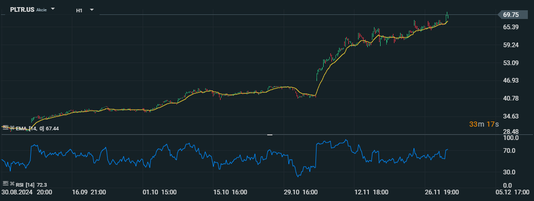 Hodinový graf akcií Palantir Technologies Inc. (PLTR) od srpna do prosince 2024 ukazuje výrazný rostoucí trend podpořený indikátory EMA a RSI. RSI na hodnotě 72,3 naznačuje překoupené podmínky, což odpovídá nedávnému 61% nárůstu akcií v listopadu. Zdroj: xStation5