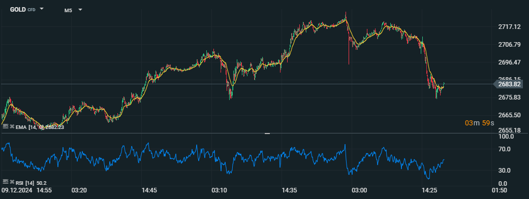 Pokles cen zlata v návaznosti na data PPI v USA a rostoucí počet žádostí o podporu v nezaměstnanosti. Graf ukazuje volatilitu na trhu zlata dne 12. prosince 2024. Zdroj: xStation5