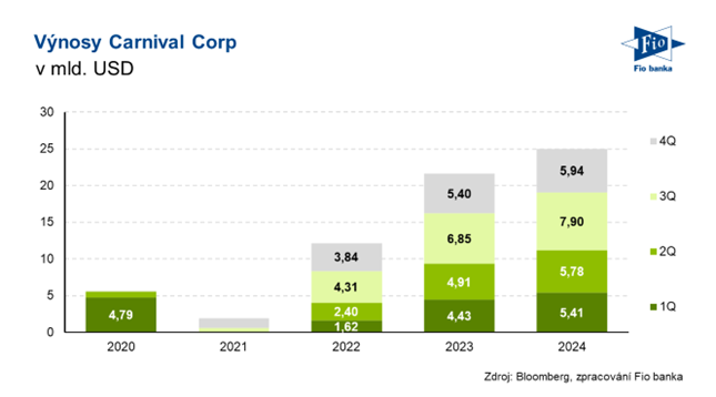 Celoroční tržby Carnival Corp. za rok fiskální rok 2024 dosáhly rekordní výše 25 mld. USD a vzrostly tak meziročně o 15 %. Čistý zisk dosáhl 1,9 mld. USD a překonal očekávání managementu o více než 130 mil. USD.