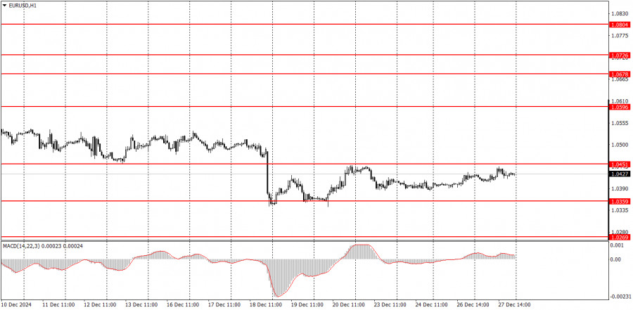 Pár EUR/USD v pátek vykazoval nízkou volatilitu a pohyboval se v podstatě do strany. V důsledku toho není co analyzovat. Trh v současné době zažívá období vánočního klidu a nejsou k dispozici žádné makroekonomické zprávy ani významné události, které by bylo třeba brát v úvahu. V této situaci je nejlepší vyčkat na závěr novoročního flatu. Případně lze obchodovat ve vyšších časových rámcích, kde se současné podmínky na trhu nemusí jevit jako flat. V tomto případě by však bylo třeba obchody držet alespoň týden.
