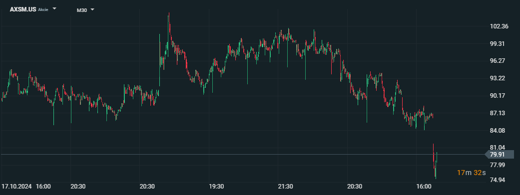 Cenový pokles Axsome Therapeutics: Akcie klesly o 11 % na $77,02 po smíšených výsledcích klinických studií Zdroj: xStation5