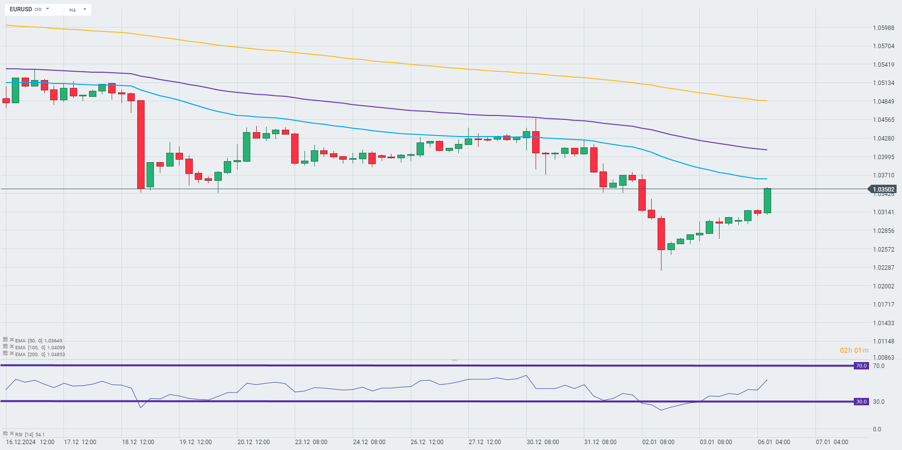 Měnový pár EUR/USD získává po zveřejnění lepších než očekávaných údajů PMI ve službách za prosinec. Lepší údaje, které naznačují zlepšující se ekonomické podmínky v hlavních ekonomikách Evropské unie, mohou povzbudit ECB k pomalejšímu snižování sazeb, což přirozeně posiluje EUR.