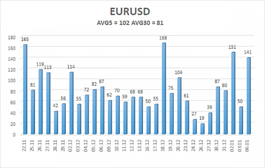 Průměrná volatilita měnového páru EUR/USD za posledních pět obchodních dní činí k 7. lednu 102 pipů; tato hodnota se považuje za "vysokou". V úterý očekáváme pohyb páru mezi úrovněmi 1,0280 a 1,0484. Vyšší lineární regresní kanál směřuje dolů a naznačuje tak pokračování celkového downtrendu. Indikátor CCI znovu vstoupil do zóny přeprodanosti a vytvořil novou býčí divergenci. Tento signál ale stále naznačuje maximálně tak korekci.