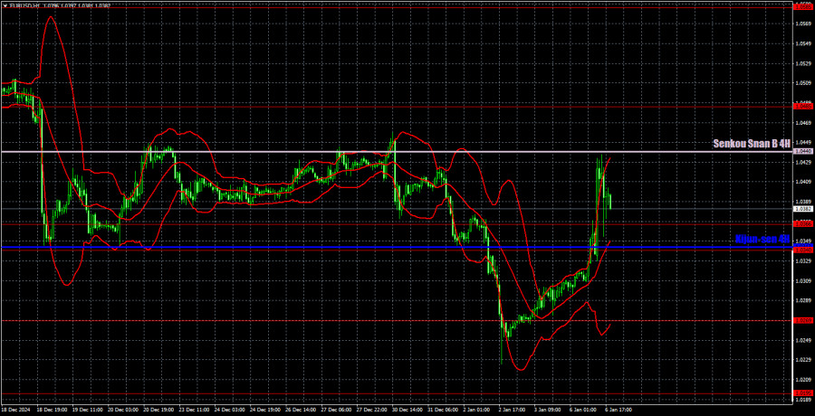 Měnový pár obnovil v grafu 1H downtrend, ale v posledních dvou dnech zaznamenal prudkou korekci. Věříme, že ve střednědobém horizontu bude pokračovat pokles. Federální rezervní systém plánuje snížit úrokové sazby v roce 2025 pouze jednou nebo dvakrát, což je mnohem jasnější jestřábí přístup, než trh původně očekával. Stále nevidíme důvody k výraznému růstu eura. Medvědí sentiment pevně spočívá pod linií Senkou Span B.