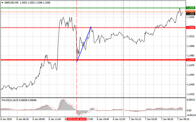 Ve druhé polovině dne došlo k otestování ceny 1,2528 současně s poklesem ukazatele MACD výrazně pod linii nula, což omezilo potenciál měnového páru směrem dolů. Z toho důvodu jsem se rozhodl libru neprodávat. Později, když cena dosáhla úrovně 1,2478, jsem plánoval libru při odrazu nakoupit, což mi umožnilo zajistit si na trhu zisk ve výši zhruba 30 pipsů.