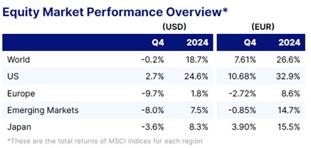 Tabulka: Rok2024 byl pro globální akcie pozoruhodný, hlavně pro ty americké, které tvoří až 70 % indexu MSCI World. Ten je v současnosti neuvěřitelně koncentrovaný a do značné míry zaměřený na americké megakorporace: 20 amerických akciových titulů s největší tržní kapitalizací teď tvoří 40 % indexu. Silný americký dolar v loňském roce omezoval možný růst rozvojových trhů, ale zaostávala hlavně Evropa, i když index MSCI Europe dosáhl v EUR úctyhodných ročních výsledků.
