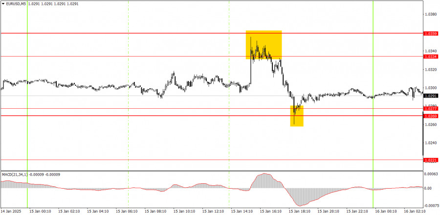 V 5minutovém časovém rámci se ve středu objevily dva jasné obchodní signály. Nejprve se pár odrazil od 1,0334–1,0359 a poté klesl do pásma 1,0269–1,0277. V průběhu dne se pár pohyboval v rozmezí 1,0269–1,0277. V obou případech došlo k odrazu, který vytvořil obchodní signál. Začínající obchodníci mohli nejprve otevřít krátkou a následně dlouhou pozici, přičemž oba obchody vedly k zisku. Dlouhá pozice se dokonce mohla přenést i do čtvrtka.