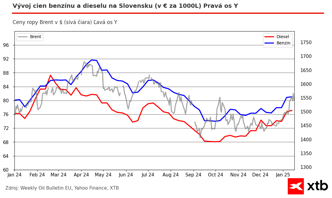 Podobný trend byl pozorován i u velkoobchodních cen pohonných hmot v Rotterdamu, které v posledních dvou týdnech výrazně vzrostly. Tento nárůst se zatím nepromítl do spotřebitelských cen na Slovensku, takže se očekává, že ceny pohonných hmot budou v důsledku sankcí i nadále růst. Zvýšení cen však nemusí mít dlouhého trvání, protože změna administrativy ve Spojených státech v příštím týdnu by mohla napětí na trhu zmírnit. V krátkodobém horizontu však ceny pravděpodobně zůstanou pod tlakem na růst.